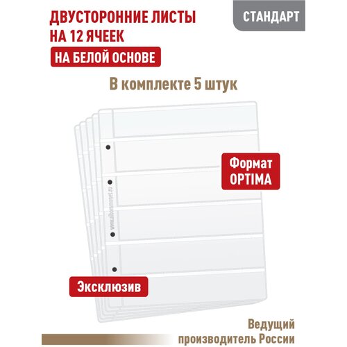 Комплект из 5-ти листов Albommonet "стандарт" на белой основе (двусторонний) для хранения на 12 ячеек. Формат "Optima"