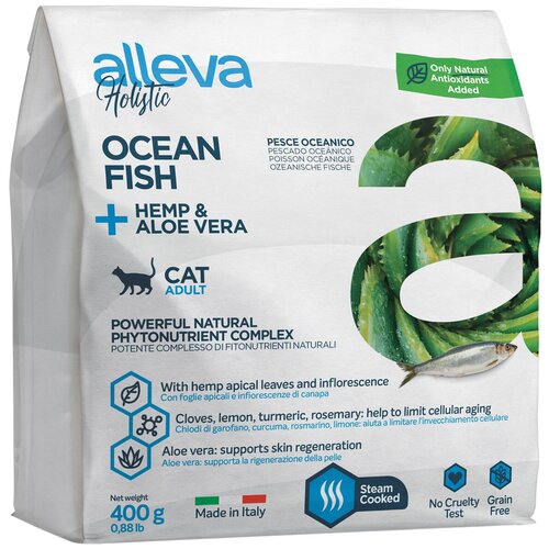 ALLEVA HOLISTIC ADULT CAT OCEAN FISH беззерновой для взрослых кошек с океанической рыбой, коноплей и алоэ вера (0,4 кг)