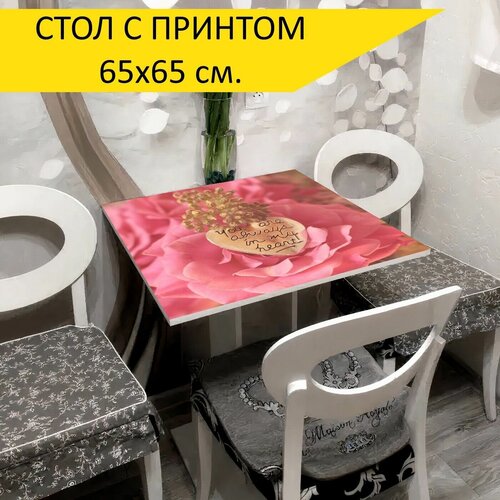 Стол "Розы, сердце, you are always in my heart", 65x65 см. Кухонный, квадратный, с принтом.