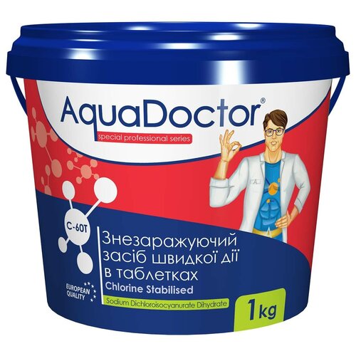 AQ15540, AquaDoctor, хлор, 1кг ведро, таблетки быстрорастворимый, на основе 60% активного хлора (C-60/1KG)
