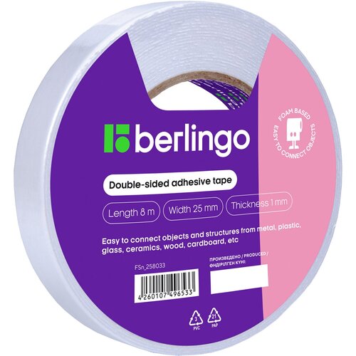 Клейкая лента двусторонняя Berlingo, 25мм*8м, на вспененной основе, 1мм