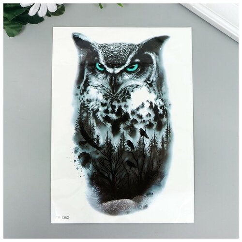 Татуировка на тело чёрная "Филин на фоне леса с воронами" 21х15 см