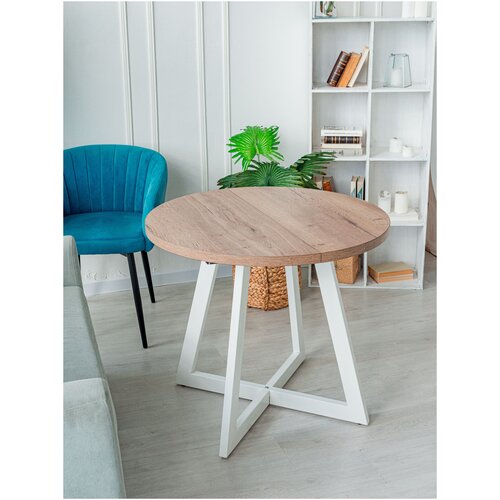 Стол CARD&LOFT S-205 круглый, подстолье- металл, цвет "белый Муар", толешница- ЛДСП, цвет "Дуб Галифакс натуральный", раздвижной, диаметр -85 см