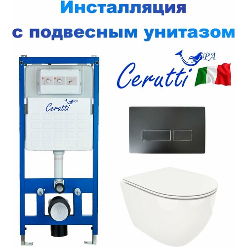 Комплект 4 в 1 инсталляция с подвесным унитазом Cerutti SPA Sella Aria MB (черный матовый), микролифт, кнопка смыва черная (CR556+CT9160+CR02ВК)