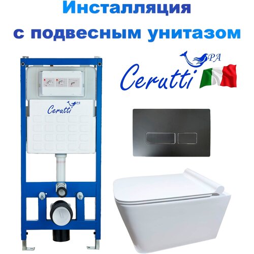 Комплект 4 в 1 инсталляция с подвесным унитазом Cerutti SPA Ticino Aria, сиденье микролифт, кнопка смыва черная (CR555+CT8911+CR02BK)