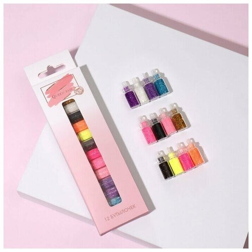 Блёстки для декора, мелкие, 12 бутылочек, в картонной коробке, разноцветные