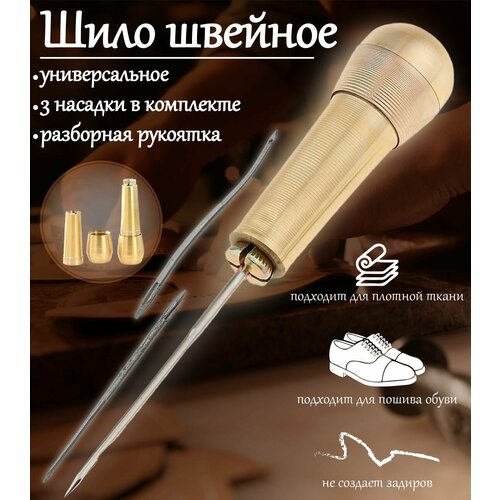 Шило швейное для одежды и обуви с тремя разными насадками, ручка медная разборная.