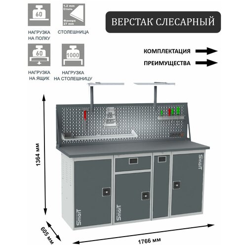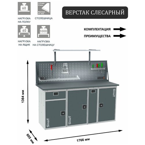 Стол производственный, верстак SMART 1760.1-1.1.P.1-1.dc универсальный в гараж, в мастерскую,1364х1766х605