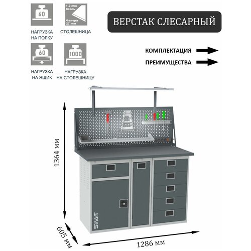 Стол производственный, верстак SMART 1280.1-1.P.5.dc универсальный в гараж, в мастерскую,1364х1286х605