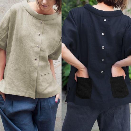DYS Плюс Размер Лето Леди Хлопок Лен Короткий рукав Пуговицы Футболка Задние карманы Топ