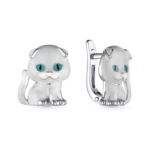 Детские серебряные серьги 925 пробы кошки породы Шотландская вислоухая с эмалью родированные.