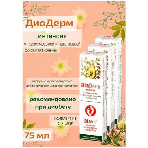 DiaVit. Крем для ног "ДиаДерм Интенсив" - комплект из 3 шт. по 75 мл, повышенным содержанием мочевины (10%), высокая эффективность (Аванта)