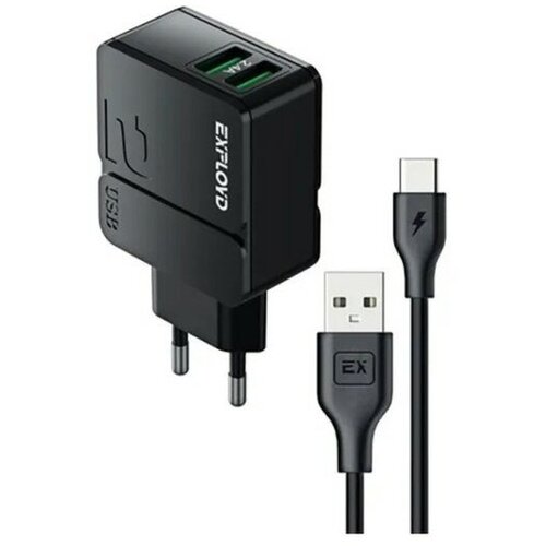 Exployd Сетевое зарядное устройство Exployd EX-Z-1442, 2 USB, 2.4 А, кабель Type-C, черное