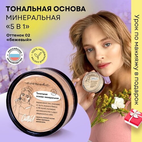 Ecomake Минеральная пудра для лица, тон 02, рассыпчатая, матирующая, стойкая с SPF 15-20