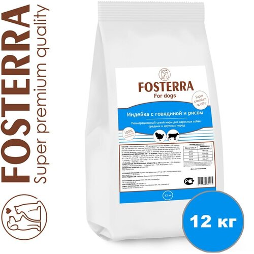 FOSTERRA Dog Индейка с говядиной и рисом. Корм супер премиум класса для взрослых собак средних и крупных пород 12 кг