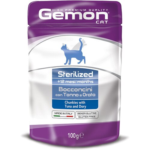 Влажный корм для стерилизованных кошек Gemon Cat Adult Sterilised con Tonno e Orata, с тунцом, с рыбой дори, 4 шт. х 100 г (кусочки в соусе)