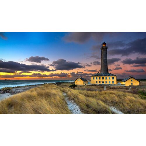 Картина на холсте 30x30 LinxOne "Lighthouse ocean grass sunset" интерьер для дома / декор на стену / дизайн