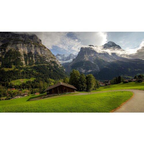 Картина на холсте 60x110 LinxOne "Mountains Clouds Alps Field Grass" интерьер для дома / декор на стену / дизайн
