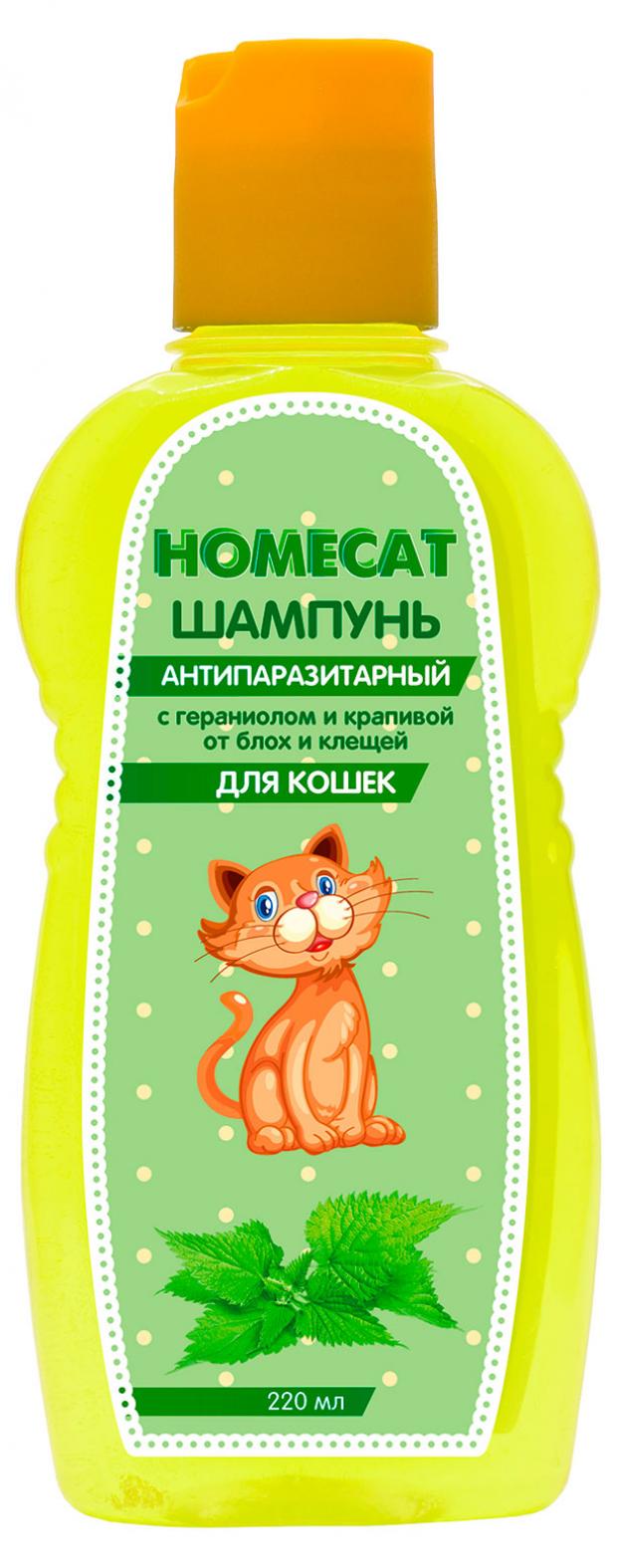 Шампунь для кошек HOMECAT антипаразитарный от блох и клещей с гераниолом и крапивой, 220 мл