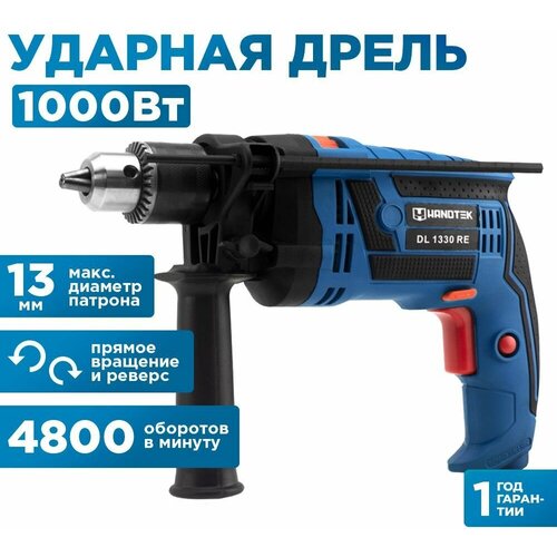 Дрель ударная Handtek-1330 RE, 1000 Вт, 4800 об.мин., строительные инструменты, доп. рукоятка, ограничитель глубины