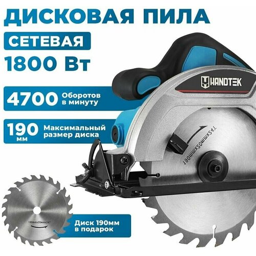 Циркулярная пила дисковая Handtek CS-190/1800 , 1800 Вт, Диск 190 мм в комплекте, 4700 об/мин, направляющая скоба , циркулярка