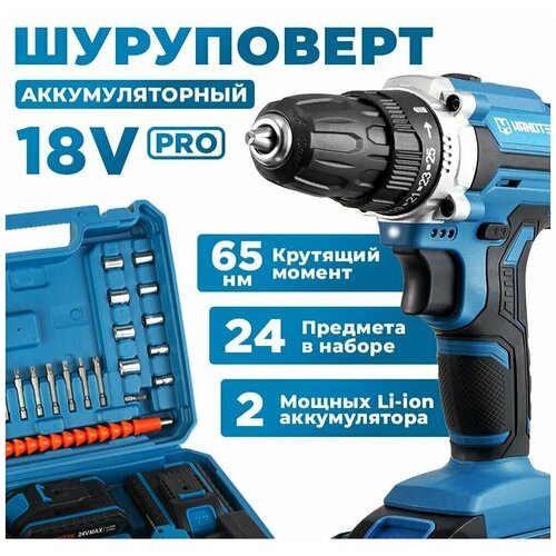 Дрель-шуруповерт аккумуляторный Handtek CD1865L2 Pro, 18В, кейс + набор оснастки, 1450 об/мин, 2 Li-ion 2 Ач, 65 Нм, 2 скорости, фонарик, реверс, з/у