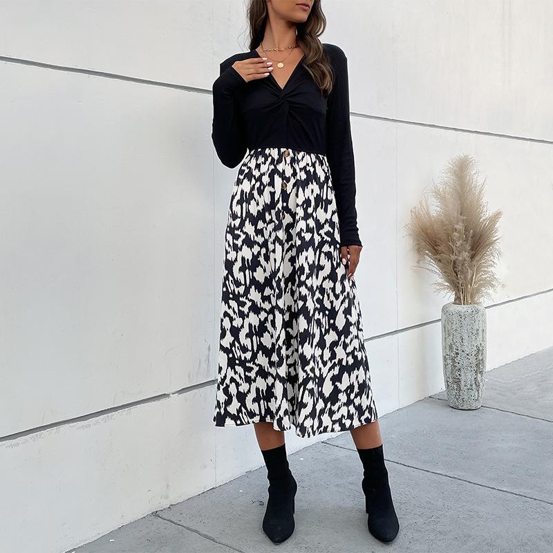 Женская весна V Шея Длинный рукав Пэчворк Длинная высокая талия Шикарное платье с принтом