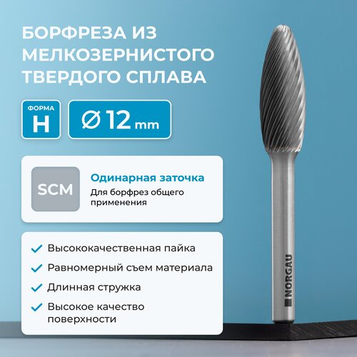 Твердосплавная пламевидная борфреза по металлу NORGAU Indusrtrial типа H размер 12х32 с заостренной вершиной и заточкой SCM