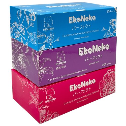 Набор. Бумажные салфетки в коробке Inshiro EkoNeko "Стандарт", 2 слоя, 3 упаковки по 200 шт