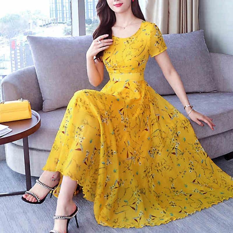 Женщины Цветочная печать Платье Лето Ледяной шелк Высокая талия Платье Короткие рукава Круглый вырез Миди Юбка