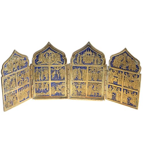 Четырехстворчатый складень с навершием "Двунадесятые праздники". Медный сплав, литье, эмаль. Россия, конец ХIX века