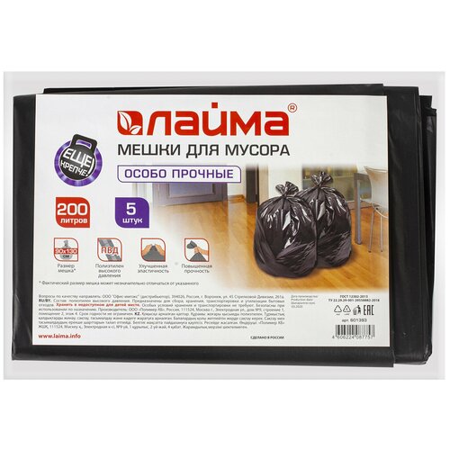 Мешки для мусора 200 л, комплект 5 шт., черные, в пачке 5 шт., особо прочные, ПВД 50 мкм, 90х130 см, LAIMA, 601393