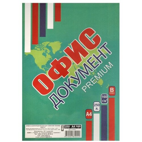 Бумага А4 250л Офис документ премиум, 160г/м2, бел 155%, класс В в т/у пленке
