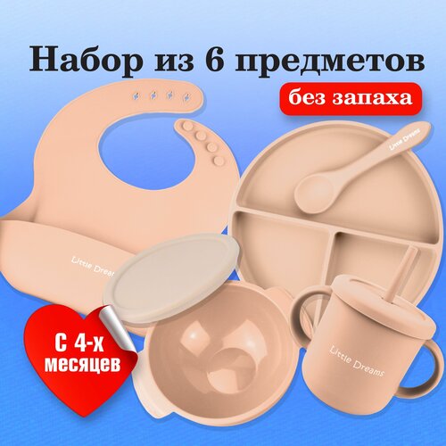 Набор детской посуды из 6 предметов для кормления малышей из силикона на присосках, цвет капучино