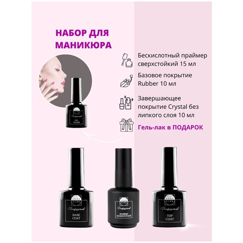 Набор для маникюра/ База каучуковая + Праймер бескислотный + Топ без липкого слоя + Подарок гель-лак
