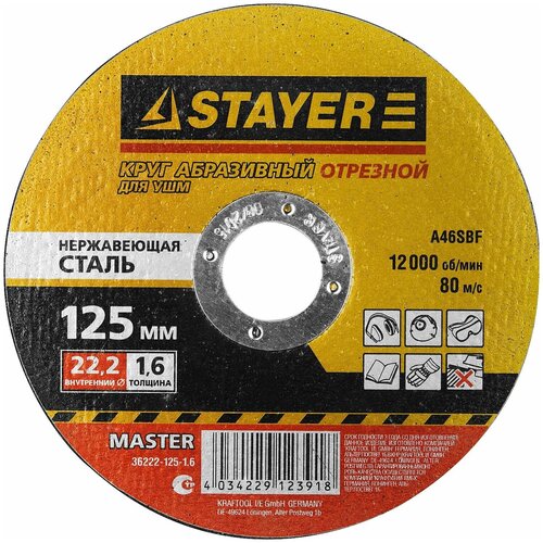 STAYER 125х1.6х22.2 мм, круг отрезной по нержавеющей стали для Угловая шлифовальная машина (болгарка) 36222-125-1.6