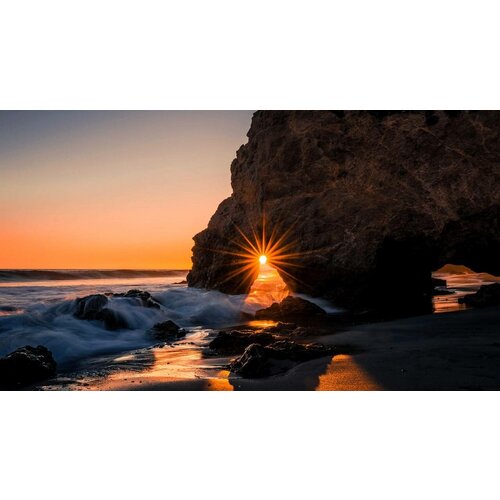 Постер на экокоже 33x50 LinxOne "Закат пляж David Dai волны" интерьер для дома / декор на стену / дизайн