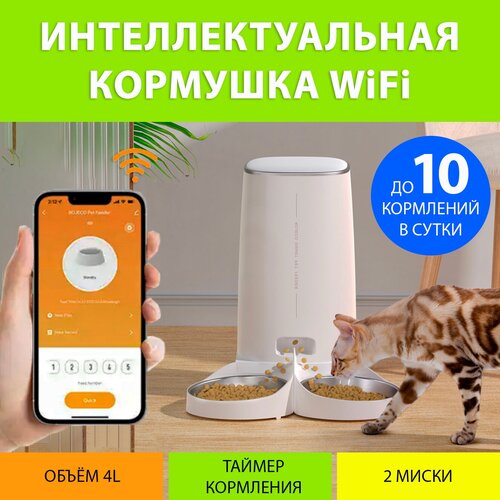 Автоматическая кормушка для кошек с камерой, видео, WiFi, 3 литра, до 10 кормлений в сутки, с таймером кормления (Белый)