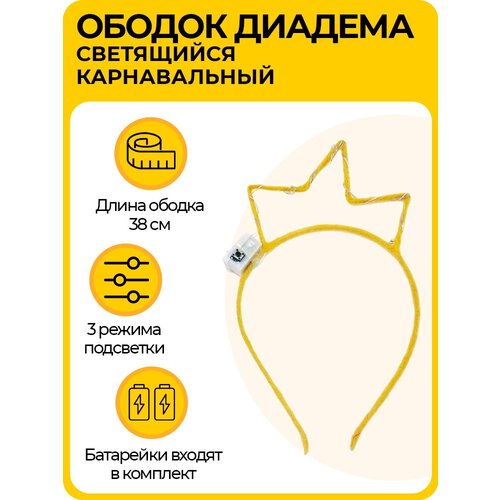 Светящийся ободок корона, карнавальная диадема с 3 режимами подсветки, для детей и взрослых, желтая