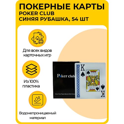 Водонепроницаемые покерные карты «Poker Club», из 100% пластика, набор карт для настольных игр, синяя рубашка, 54 шт