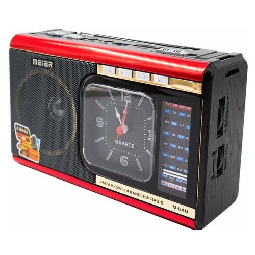 Радиоприёмник всеволновый Meier M-41BT / работает от сети, встроенного аккумулятора, батареек / Часы / Фонарик / USB/Красный