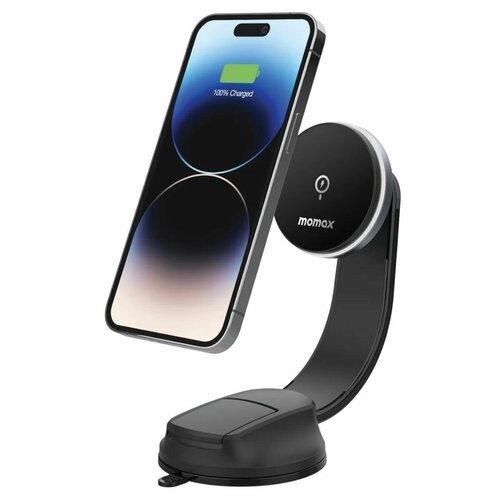 Держатель магнитный для смартфона с беспроводной зарядкой Momax Q.Mag 15 Вт, на присоске, черный