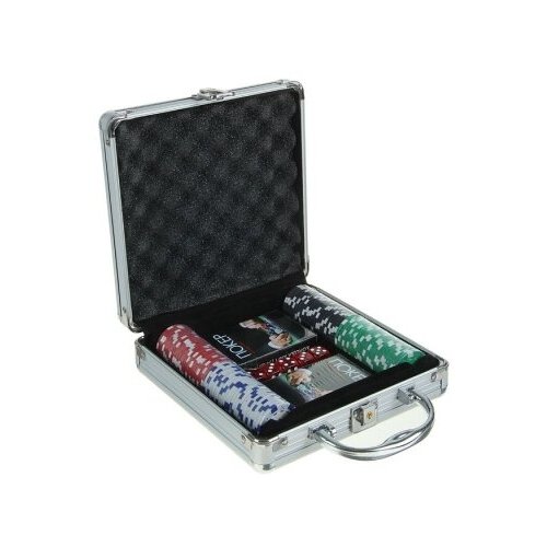 Покер в металлическом кейсе (карты 2 колоды, фишки 100 шт, 5 кубиков), 20х20 см