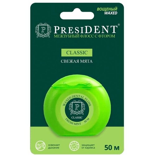 Флосс President Classic 50 м межзубный с фтором вощеный свежая мята