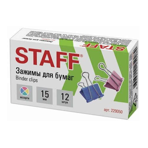 Зажимы для бумаг металлические Staff Profit (15мм, до 45 листов, цветные) картонная коробка, 12шт, 12 уп. (229050)