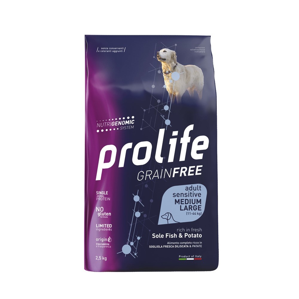 Корм для собак PROLIFE беззерновой для средних и крупных пород с чувствительным пищеварением, камбала с картофелем сух. 2,5кг