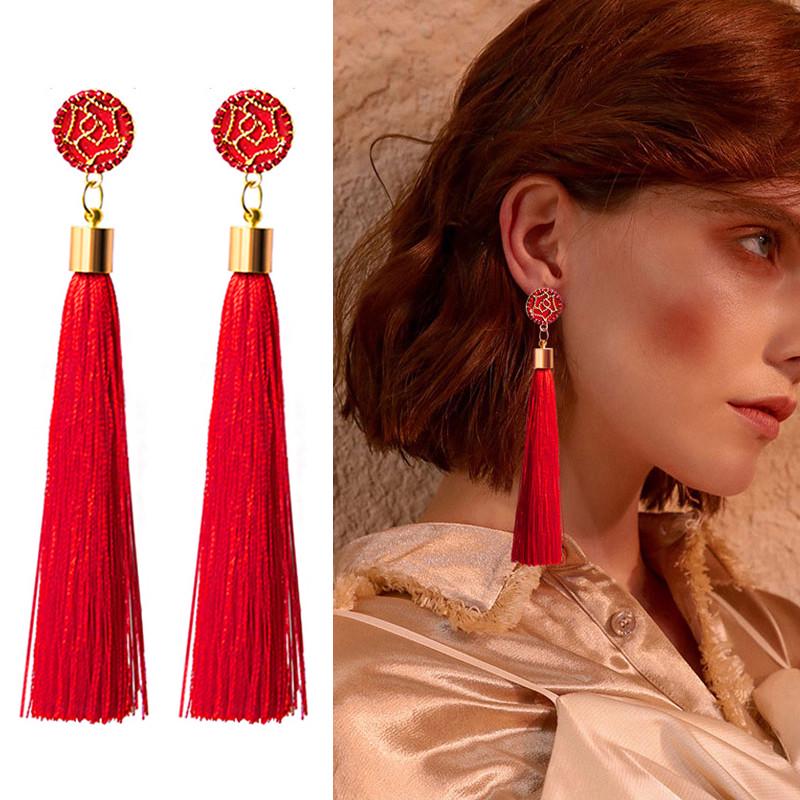 Мода чешский Tassel Длинные серьги Шелковые ткани Падение Dangle Tassel Серьги для женщин ювелирные изделия