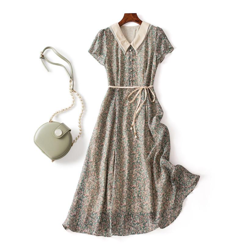 Летнее платье 2022 Prairie Шик Зеленый Маленький Цветочный Принт Короткий рукав Шифон Тонкий Длинный Миди Платье Casual Out Going