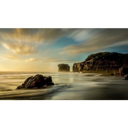 Постер на экокоже 50x70 LinxOne "Coast sea rock beach sunset" интерьер для дома / декор на стену / дизайн