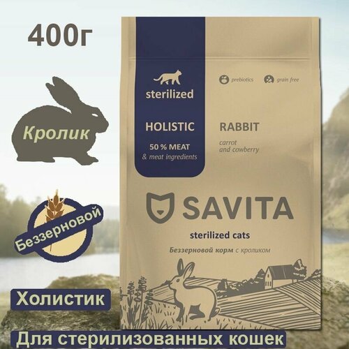 Сухой корм SAVITA для стерилизованных кошек с кроликом, беззерновой, 0,4 кг
